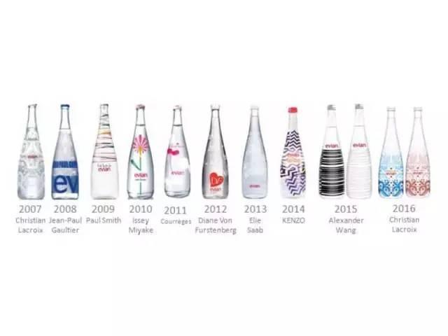 依云经常与各种设计师、时尚品牌联名推出工业设计款瓶子,比起宣传水的品质,在瓶身上作文章显然更容易使人买单。从 Elie Saab、Kenzo、Alexander Wang 到 Christian Lacroix ,普通的水瓶被赋予了多次时尚与奢侈的光环。