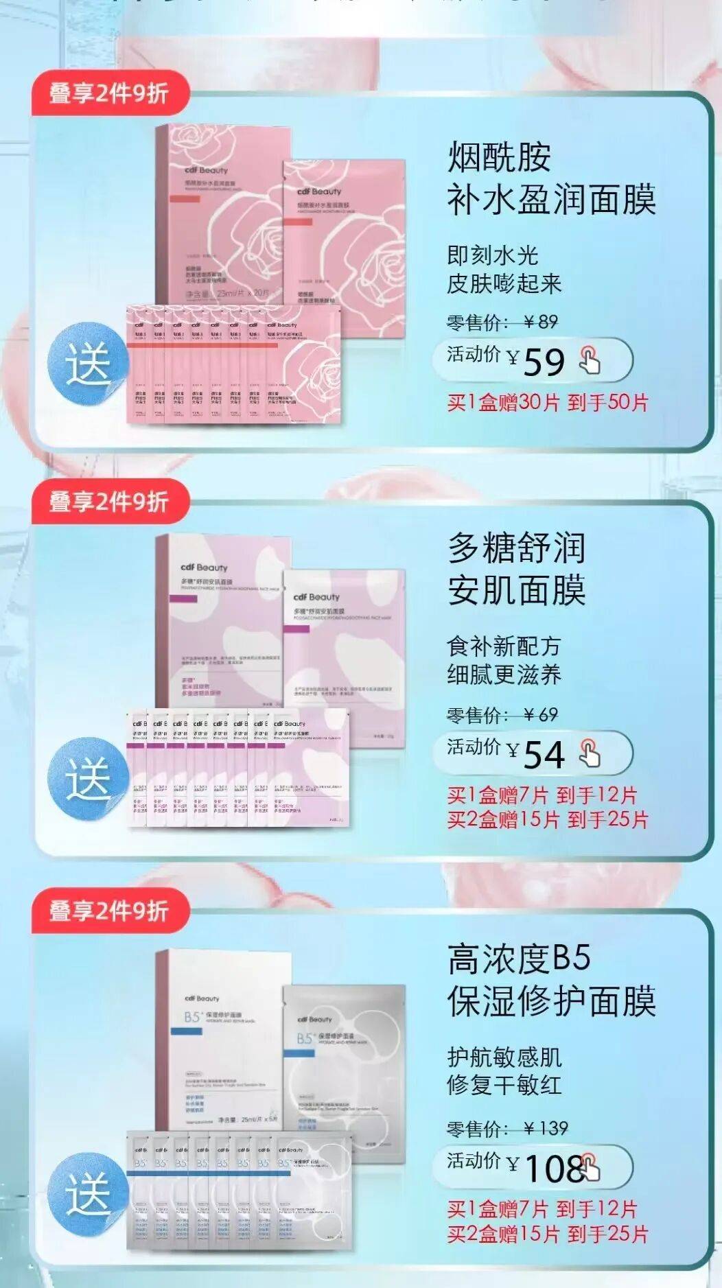 据了解,cdf Beauty推出的六款面膜,涵盖3款妆字号(烟酰胺补水盈润面膜、多糖舒润安肌面膜、B5保湿修护面膜)与3款械字号(透明质酸钠医用面膜、依克多因医用面膜、重组胶原蛋白医用面膜)产品。