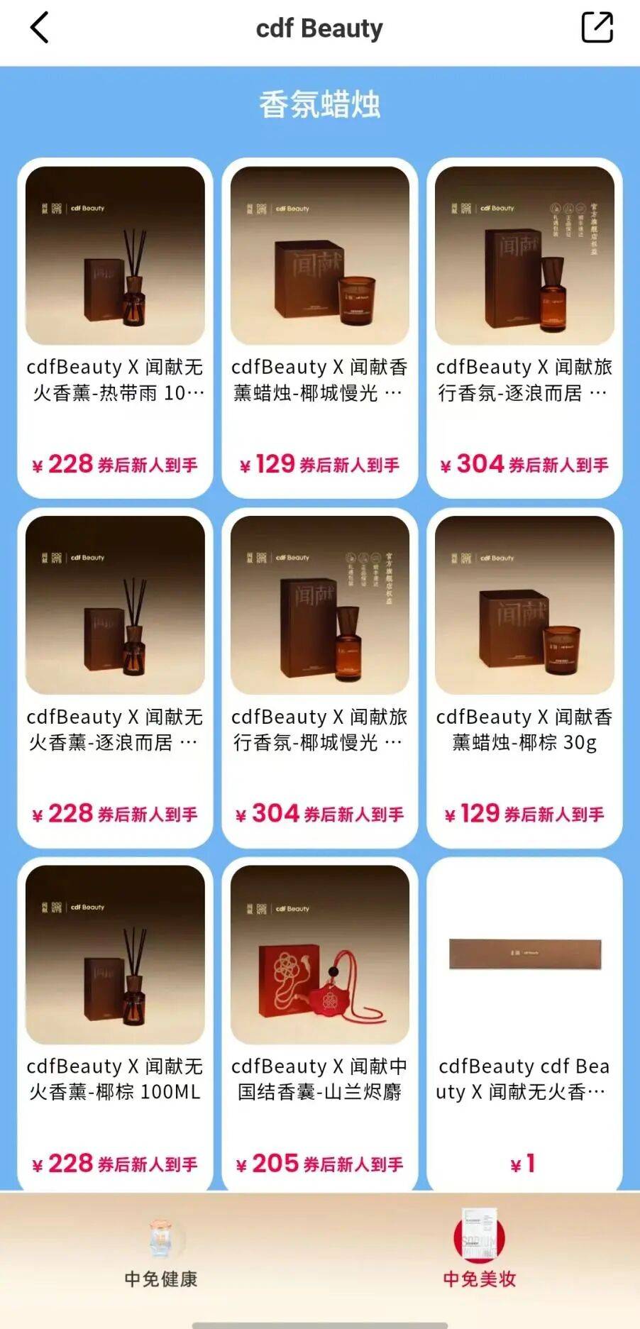 与此同时,cdf Beauty此次推出的面膜与联名香氛产品均展现出明确的高性价比定位。无论是面膜低至1.18元的单片官方活动价,还是联名香氛较原品牌同品类产品近乎二分之一的定价策略,均与其母公司中国中免以往以高端免税、国际大牌为主的贵价形象形成鲜明反差。